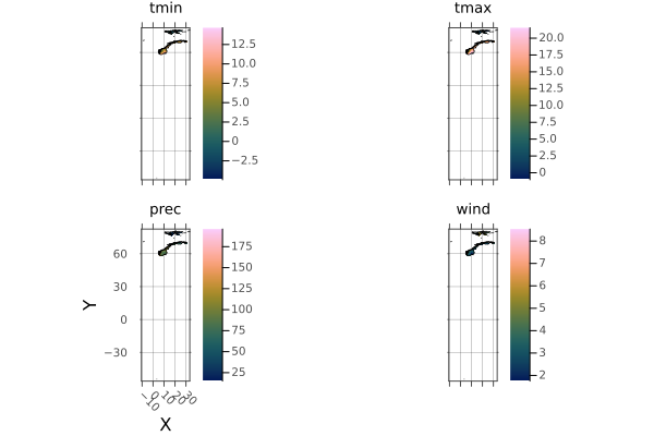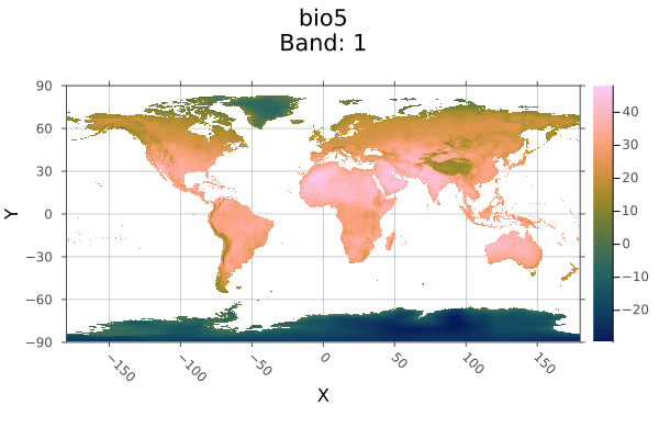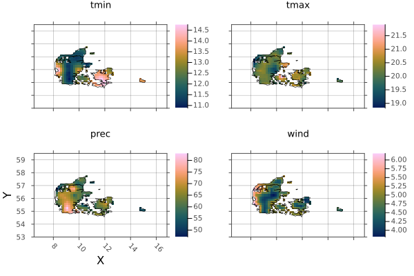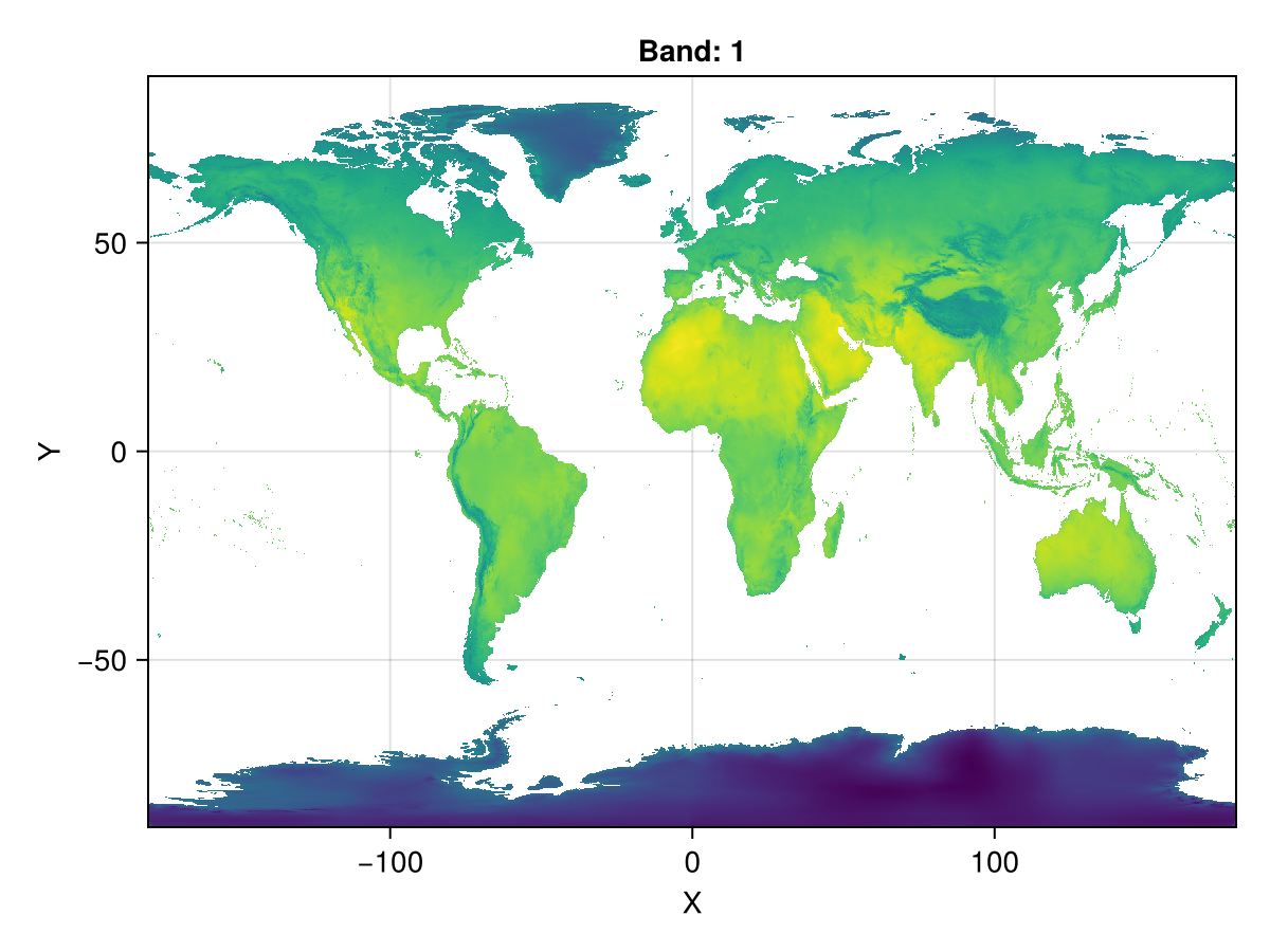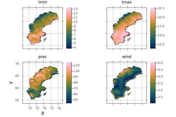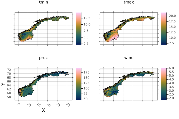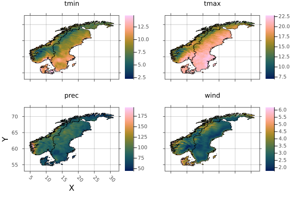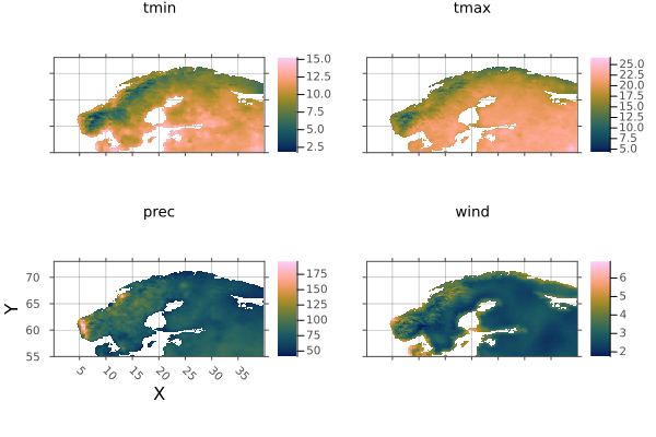 climate = RasterStack(WorldClim{Climate}, (:tmin, :tmax, :prec, :wind); month=July)┌ 2160×1080 RasterStack ┐