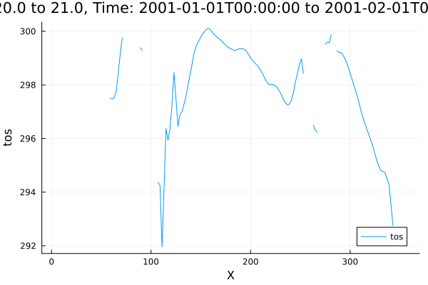write("mean_tos.nc", mean_tos)"mean_tos.nc"Plotting recipes in DimensionalData.jl are the fallback for Rasters.jl when the object doesn't have 2 X/Y/Z dimensions, or a non-spatial plot command is used. So (as a random example) we could plot a transect of ocean surface temperature at 20 degree latitude :
