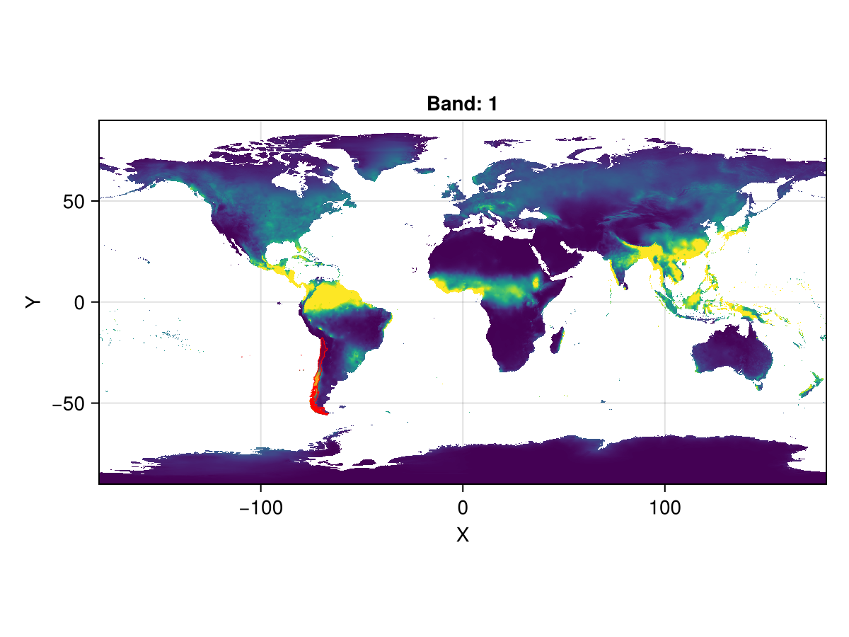 179.833 missing missing … 0.0 0.0 0.0 0.0Since the format of WorldClim's datasets for future climate is slightly different from the dataset for the historical period, this actually returned a 5-dimensional raster, with a Band dimension that represents months. Here we'll just select the 6th month, matching the selection above (but note that the analysis would also work for all Bands simultaneously).