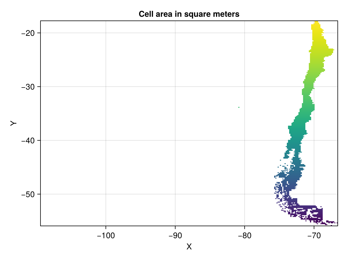 Now, let's compute the average precipitation per square meter across Chile. First, we need to get the area of each cell in square meters. We'll use the spherical method, since we're working with a geographic coordinate system. This is the default.
