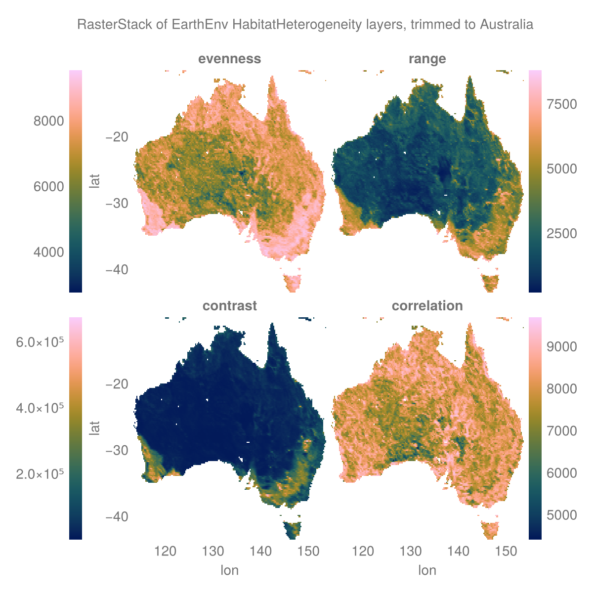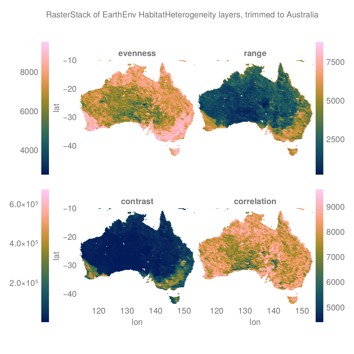 Label(fig[0, :], "RasterStack of EarthEnv HabitatHeterogeneity layers, trimmed to Australia")